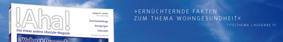 Alle Internetseiten von !Aha! und deren Inhalt, etc. sowie das "!Aha! Lifestyle-Magazin" (Name, Layout, Inhalte, etc.) sind urheberrechtlich geschützt. Jegliche Form der Weiternutzung, Vervielfältigung, auch auszugsweise, bedarf der ausdrücklich schriftlichen Genehmigung der Herausgeber (Kontakt). |