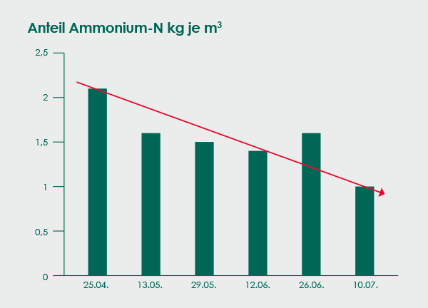 Eines der wenigen Messergebnisse hinsichtlich Ammonium in mikrobiell veredelter Gülle ist von "JBS/Hansen" und belegt eine deutliche Ammonium-Reduktion von 50 %:
